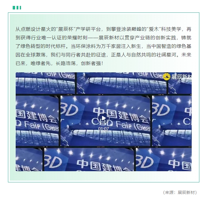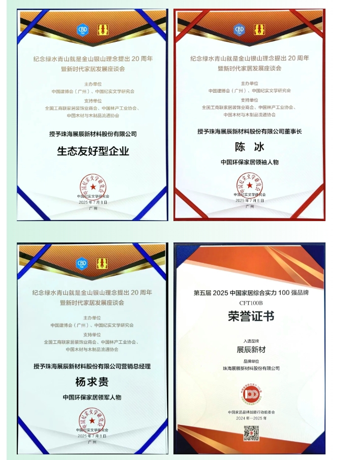 在“紀(jì)念綠水青山就是金山銀山理念提出20周年暨新時(shí)代家居發(fā)展座談會(huì)”上,展辰新材榮獲多項(xiàng)重磅榮譽(yù):作為中國(guó)涂料行業(yè)唯一代表獲授“生態(tài)友好型企業(yè)”稱號(hào);董事長(zhǎng)陳冰榮膺中國(guó)涂料行業(yè)唯一“中國(guó)環(huán)保家居領(lǐng)袖人物”;營(yíng)銷總經(jīng)理?xiàng)钋筚F當(dāng)選“中國(guó)環(huán)保家居領(lǐng)軍人物”;以唯一專業(yè)木器涂料品牌榮登“第五屆2025中國(guó)家居綜合實(shí)力100強(qiáng)品牌”榜單。