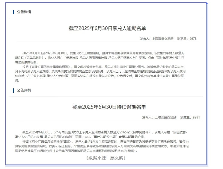 2025年上半年已經(jīng)結(jié)束,票據(jù)逾期情況依舊不容樂觀,且有愈演愈烈之勢。根據(jù)上海票交所發(fā)布的名單,2025年6月承兌人逾期名單上承兌人數(shù)量為889家,上海票交所將暫停這889家承兌人的票據(jù)承兌功能。6月持續(xù)逾期名單上承兌人有5165家,上海票交所將根據(jù)名單中的持續(xù)逾期開始時間算起,暫停其承兌、貼現(xiàn)、保證、質(zhì)押等功能2年。