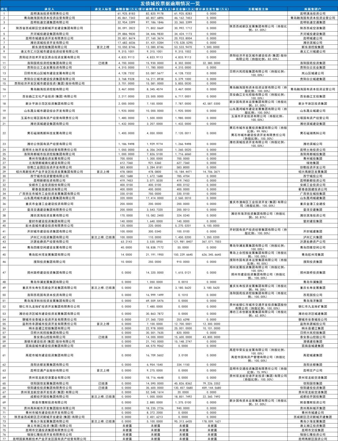 上海票交所公布的名單顯示,截至2025年6月30日,承兌人逾期名單和持續(xù)逾期名單涉及77家發(fā)債城投,票據(jù)總逾期余額達(dá)30.71億元。