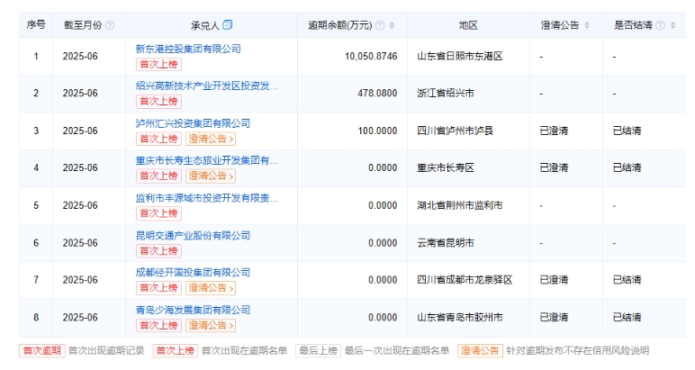 其中, 8家發(fā)債城投公司為首次上榜,分布在山東、浙江、四川、重慶、湖北、云南六省。新東港控股集團(tuán)有限公司逾期余額為10050.8746萬元;紹興高新技術(shù)產(chǎn)業(yè)開發(fā)區(qū)投資發(fā)展集團(tuán)有限公司逾期余額為478.08萬元。