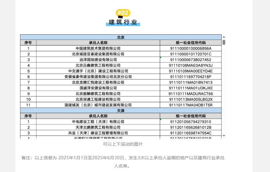 記者統(tǒng)計了 2025年1月1日至2025年6月30日,發(fā)生3次以上承兌人逾期的地產(chǎn)以及建筑行業(yè)承兌人名單,這些曾經(jīng)風(fēng)光無限的企業(yè),如今卻淪為被人指指點點,或?qū)⒆呦虻归]之路的“危樓”。