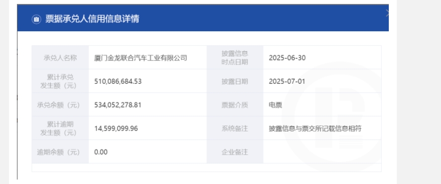 2025年上半年,廈門金龍的累計承兌發(fā)生額達(dá)到5.1億元,承兌余額為5.34億元, 而累計逾期發(fā)生額則為 1459.9萬元。上海票交所已暫停該公司的商業(yè)匯票承兌服務(wù)權(quán)限。