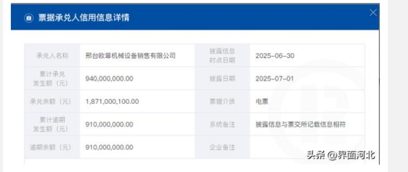 工程機(jī)械領(lǐng)域, 截至 2025年6月30日,邢臺歐菲機(jī)械累計逾期發(fā)生額為9.1億元, 逾期余額為 9.1億元。