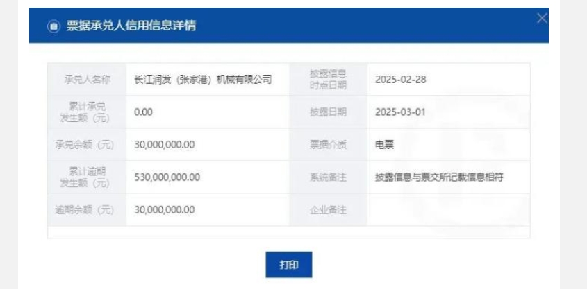 據(jù) 3月份數(shù)據(jù), 長江潤發(fā)(張家港)機(jī)械有限公司 累計承兌金額 3000萬元,全部逾期未兌付。更嚴(yán)重的是,其歷史累計逾期金額已高達(dá) 5.3億元,目前票據(jù)新增承兌為0.業(yè)務(wù)疑似全面停滯。