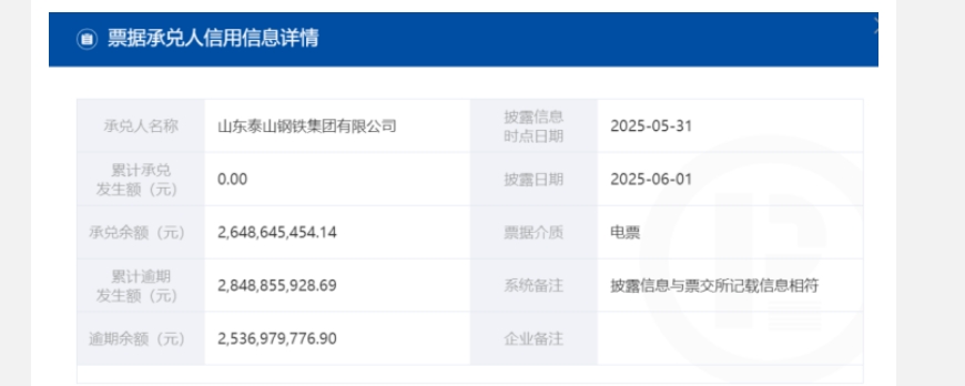 鋼鐵行業(yè),知名企業(yè)山東泰山鋼鐵不幸 “淪陷”。 截止 2025年6月1日,山東泰山鋼鐵集團(tuán)有限公司的商業(yè) 承兌匯票逾期余額已達(dá) 25.36億元,承兌余額為 26.48億元。