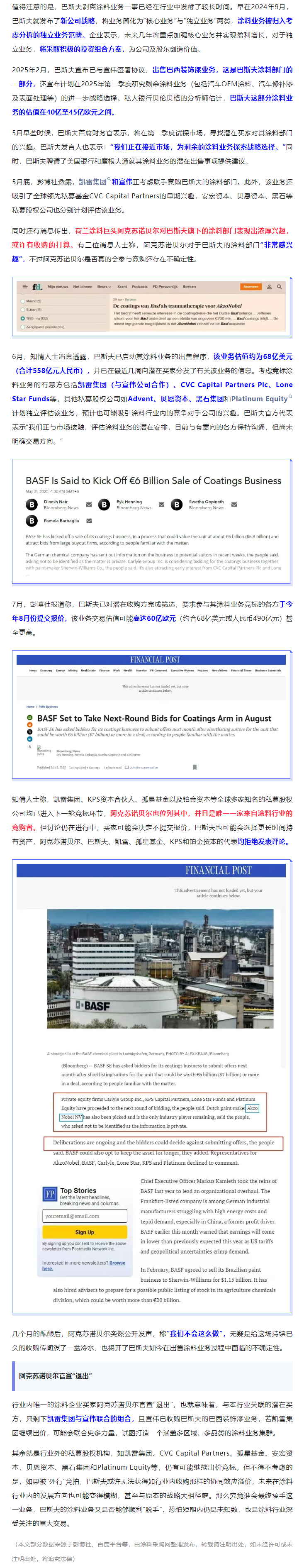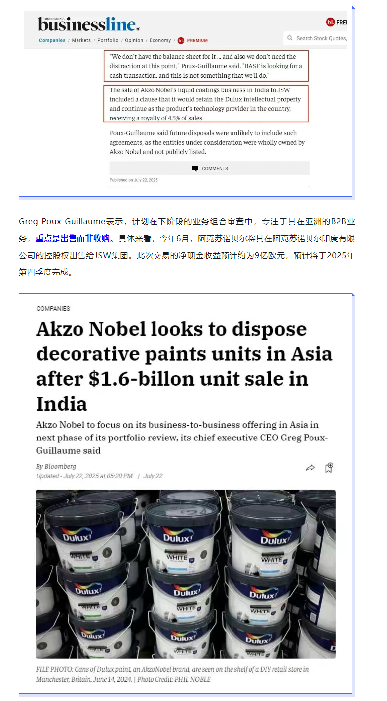 近日,外資涂料巨頭巴斯夫剝離涂料業(yè)務(wù)一事再起波瀾,據(jù)路透社報道,阿克蘇諾貝爾首席執(zhí)行官Greg Poux-Guillaume被問及“考慮收購巴斯夫的涂料業(yè)務(wù)”時指出,“阿克蘇諾貝爾尚未承諾進行任何這樣的程序。”其還表示“我們沒有這方面的資產(chǎn)負債表……而且我們現(xiàn)在不需要分心……巴斯夫正在尋求現(xiàn)金交易,而我們不會這么做。”這似乎體現(xiàn)出了阿克蘇諾貝爾對于收購巴斯夫涂料業(yè)務(wù)的“婉拒”態(tài)度。