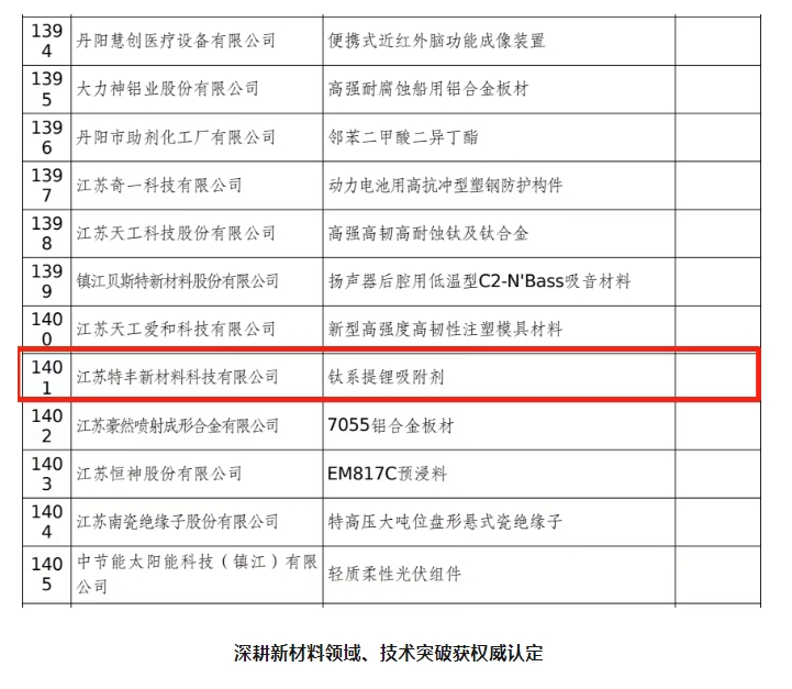 近日,江蘇省工業(yè)和信息化廳正式公示 2025 年度江蘇省 “三首兩新” 擬認(rèn)定技術(shù)產(chǎn)品名單。經(jīng)過嚴(yán)格規(guī)范的評(píng)審流程,江蘇特豐新材料科技有限公司(以下簡(jiǎn)稱 “特豐新材”)自主研發(fā)的核心產(chǎn)品 ——“鈦系提鋰吸附劑” 成功躋身 “兩新” 技術(shù)產(chǎn)品目錄。這一重要成果不僅是對(duì)特豐新材在新能源材料領(lǐng)域技術(shù)創(chuàng)新實(shí)力的權(quán)威認(rèn)證,更標(biāo)志著企業(yè)在關(guān)鍵材料自主研發(fā)賽道上的核心競(jìng)爭(zhēng)力實(shí)現(xiàn)了新突破,為其深耕新能源產(chǎn)業(yè)、推動(dòng)技術(shù)成果產(chǎn)業(yè)化奠定了堅(jiān)實(shí)基礎(chǔ)。