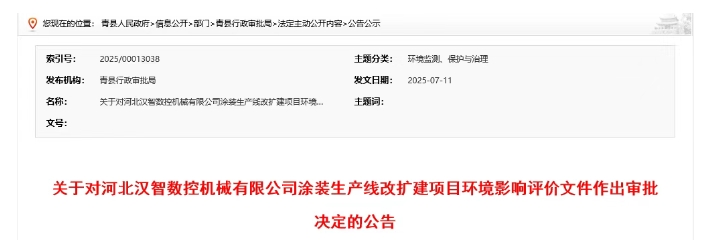 近日,青縣行政審批局發(fā)布關(guān)于對河北漢智數(shù)控機(jī)械有限公司涂裝生產(chǎn)線改擴(kuò)建項目環(huán)境影響評價文件作出審批決定的公告。