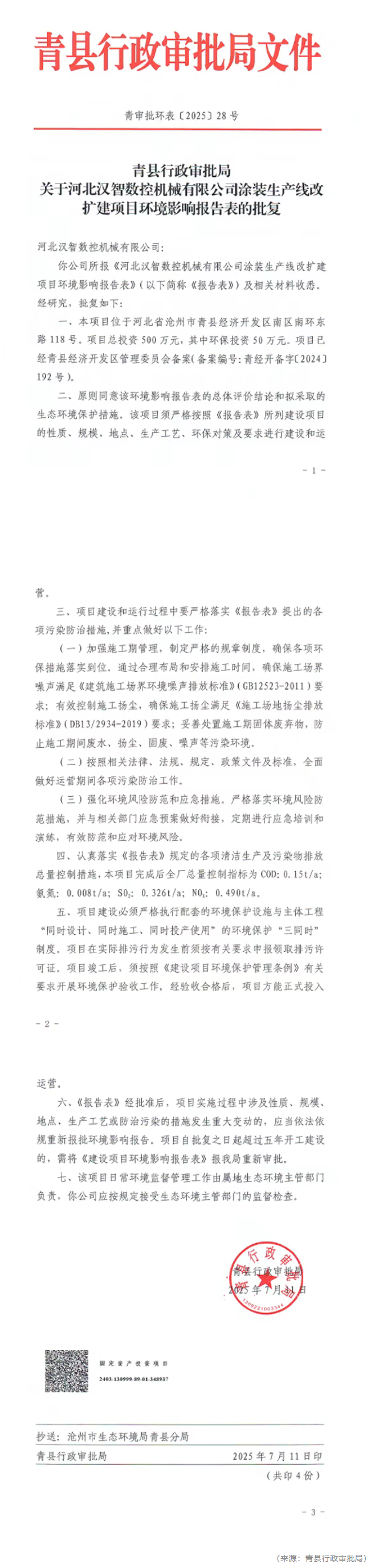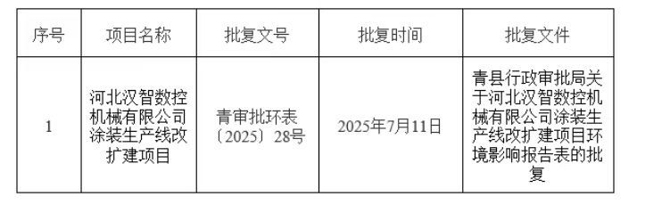 根據(jù)建設(shè)項目環(huán)境影響評價審批程序的有關(guān)規(guī)定,經(jīng)審查,青縣行政審批局對河北漢智數(shù)控機(jī)械有限公司涂裝生產(chǎn)線改擴(kuò)建項目環(huán)境影響評價文件作出審批決定?,F(xiàn)將作出的審批決定情況予以公告,具體內(nèi)容見附表。