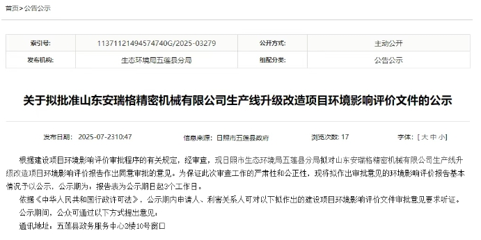 近日,日照市五蓮縣政府發(fā)布關(guān)于擬批準(zhǔn)山東安瑞格精密機(jī)械有限公司生產(chǎn)線升級(jí)改造項(xiàng)目環(huán)境影響評(píng)價(jià)文件的公示。