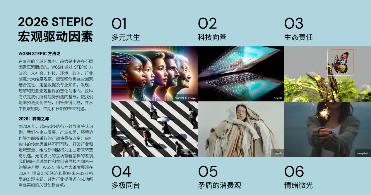 “2026年將成為全球消費(fèi)市場的轉(zhuǎn)向之年。”WGSN趨勢報(bào)告中指出,這一判斷源自其獨(dú)創(chuàng)的STEPIC方法論(社會/科技/環(huán)境/政治/行業(yè)/創(chuàng)意)對六大宏觀維度的聯(lián)動分析。在社會多元共生加速、科技向善成為共識、生態(tài)責(zé)任日益迫切的背景下,消費(fèi)者正重新校準(zhǔn)生活重心:不再盲目追捧濾鏡式的完美主義,轉(zhuǎn)而尋求真實(shí)、穩(wěn)定與個(gè)人實(shí)現(xiàn)的價(jià)值錨點(diǎn)。