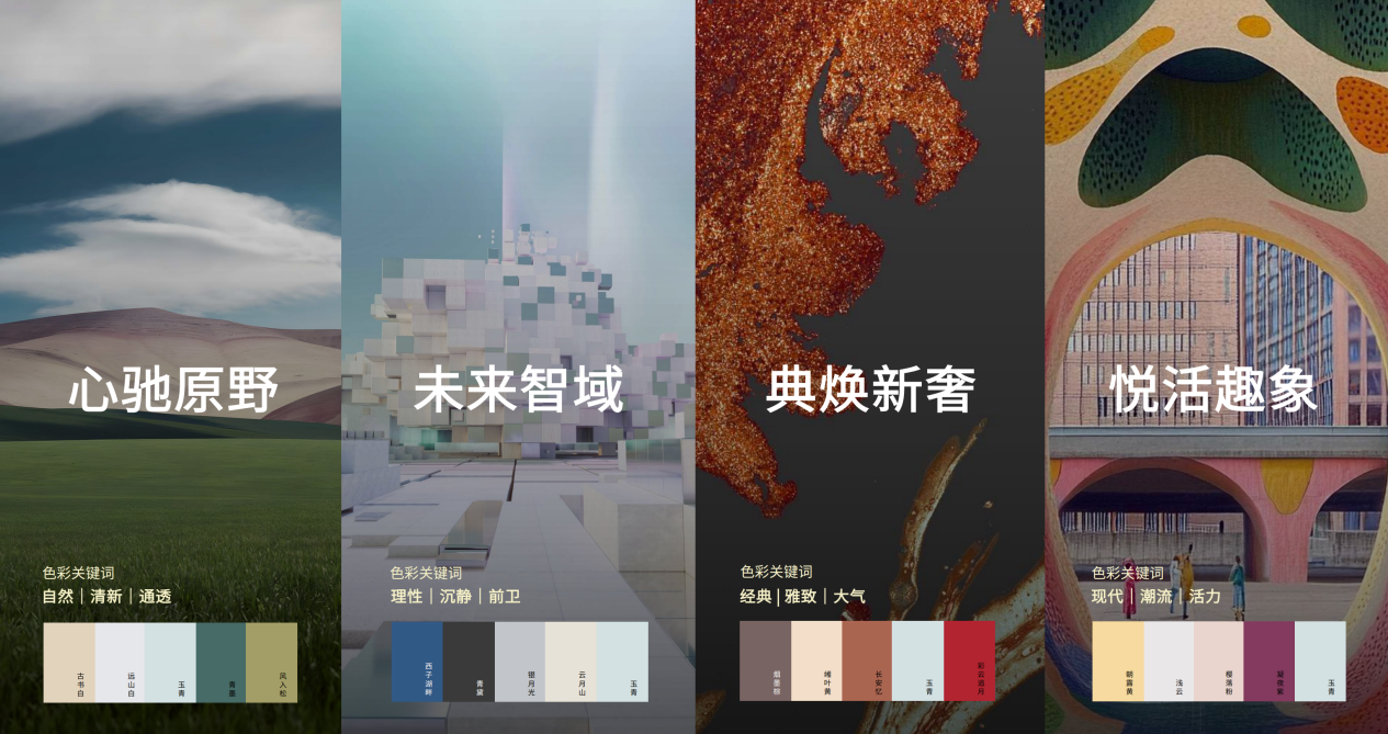 值得一提的是,報(bào)告中頗具創(chuàng)新性的是從時(shí)間、空間、情緒、文化四個(gè)維度的色彩敘事。WGSN與三棵樹將消費(fèi)畫像與空間情緒精準(zhǔn)對接,形成四大色盤皆為「新境」的細(xì)分表達(dá):