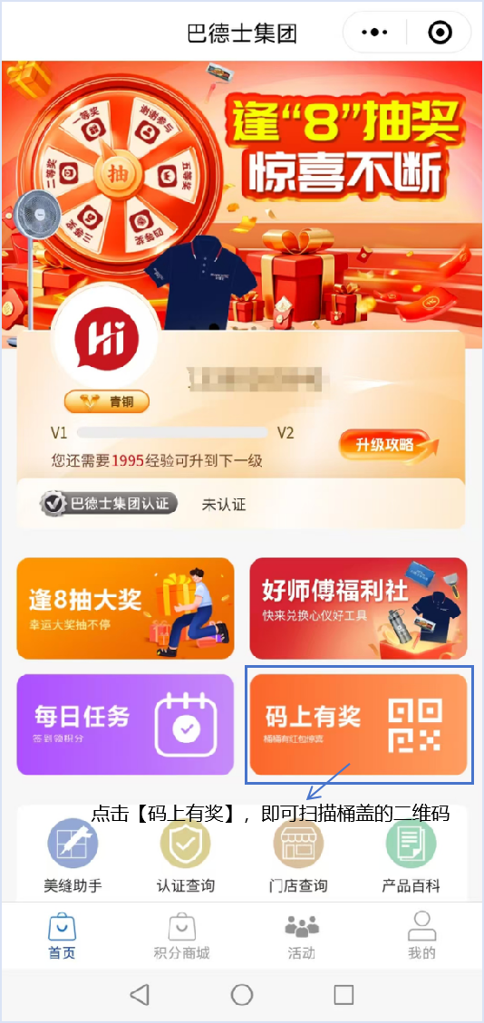 購買巴德士藝術漆、中高端內墻產品、仿石漆主推產品、防水基材(防水系列、界面系列、鋪貼系列)等積分活動產品,開桶后在產品桶蓋上找到專屬的積分二維碼標簽,掃碼即可獲得會員積分,桶桶有獎,最低10積分。
