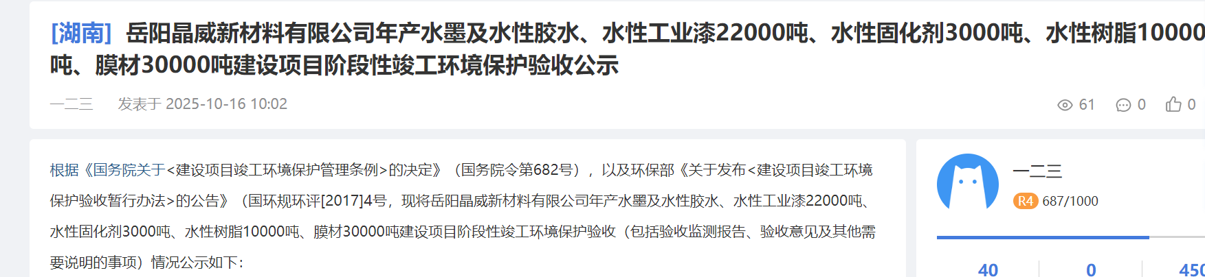 近日,岳陽晶威新材料有限公司《年產水墨及水性膠水、水性工業(yè)漆22000噸、水性固化劑3000噸、水性樹脂10000噸、膜材30000噸建設項目》進行環(huán)保驗收公示。