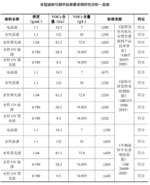 本項(xiàng)目含揮發(fā)性有機(jī)物的涂料有電泳漆、水性面漆、水性罩光漆、水性UV 面漆、水性 UV 罩光漆。