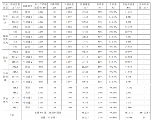項(xiàng)目水性UV漆調(diào)配后含固率約49.29%,理論用漆量為187.972t/a,企業(yè)實(shí)際申報(bào)使用量共為188t/a(含稀釋劑水),油漆調(diào)配后含固率約61.65%,理論用 漆量為53.844t/a,企業(yè)實(shí)際申報(bào)使用量共為54t/a,實(shí)際生產(chǎn)過(guò)程中存在一定的 損耗,基本能與產(chǎn)能相匹配.