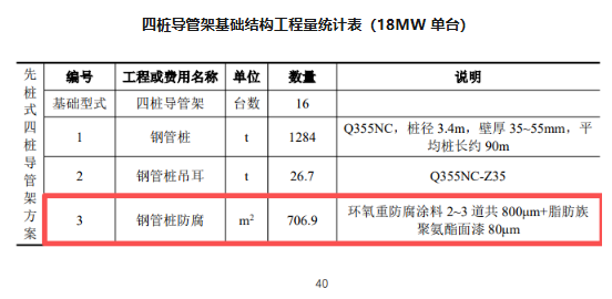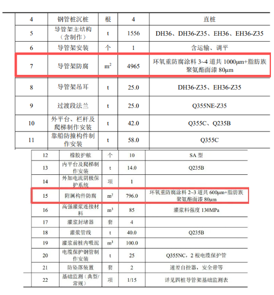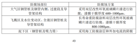 泥下區(qū)防腐應(yīng)采用陰極保護(hù)。當(dāng)采用陰極保護(hù)和涂料聯(lián)合防腐時(shí),泥面以下 3.0m可不采取涂料保護(hù)。 內(nèi)部區(qū)的防腐蝕多采用涂層。涂層一般選用富鋅底漆加環(huán)氧漆即可。 本項(xiàng)目根據(jù)風(fēng)機(jī)基礎(chǔ)構(gòu)件所處的不同腐蝕分區(qū),分別采取相應(yīng)的防腐措施:
