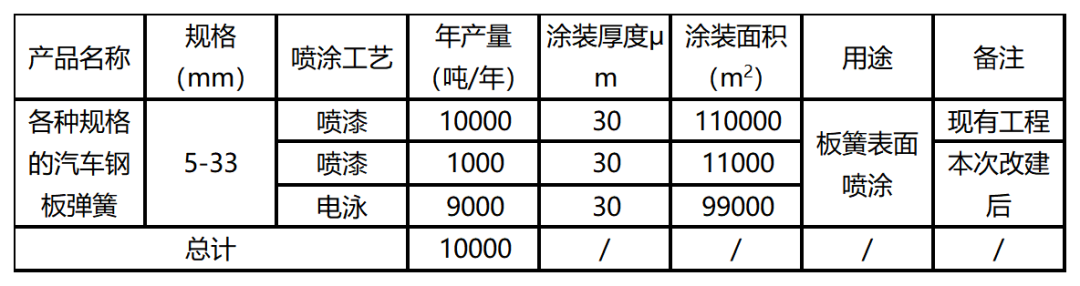項(xiàng)目生產(chǎn)產(chǎn)品與現(xiàn)有工程相同,為各種規(guī)格的汽車鋼板彈簧,板簧片厚度為5-33mm,現(xiàn)有工程表面處理汽車鋼板彈簧噴漆生產(chǎn)線總產(chǎn)量10000t/a,本次改建項(xiàng)目為拆除手工補(bǔ)漆工序,改建一條規(guī)模9000噸/年電泳生產(chǎn)線,表面處理汽車鋼板彈簧總產(chǎn)量不變,為10000t/a,噴漆生產(chǎn)線產(chǎn)能減少至1000t/a。