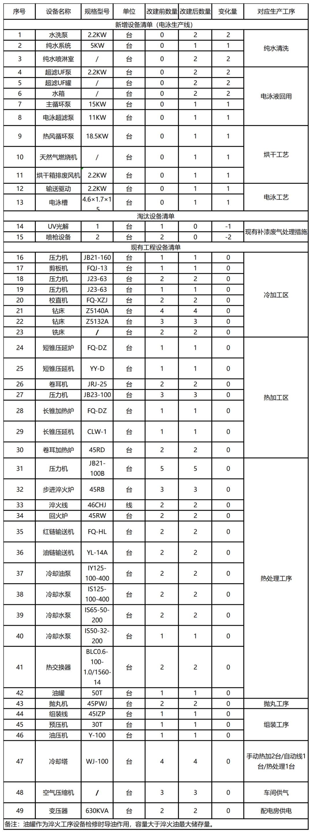 改建后全廠生產(chǎn)設(shè)備匯總表