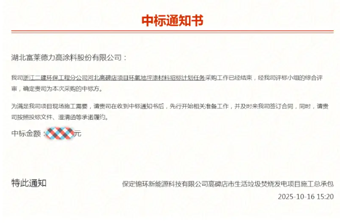 近日,湖北富萊德力高涂料股份有限公司(以下簡稱“富萊德力高涂料”)在激烈的市場競爭中脫穎而出,成功中標(biāo)保定錦環(huán)新能源科技有限公司高碑店市生活垃圾焚燒發(fā)電項目的環(huán)氧地坪漆材料采購任務(wù)。富萊德力高涂料憑借優(yōu)質(zhì)的產(chǎn)品性能、完善的技術(shù)方案及可靠的履約能力,獲得評標(biāo)小組的一致認(rèn)可 。