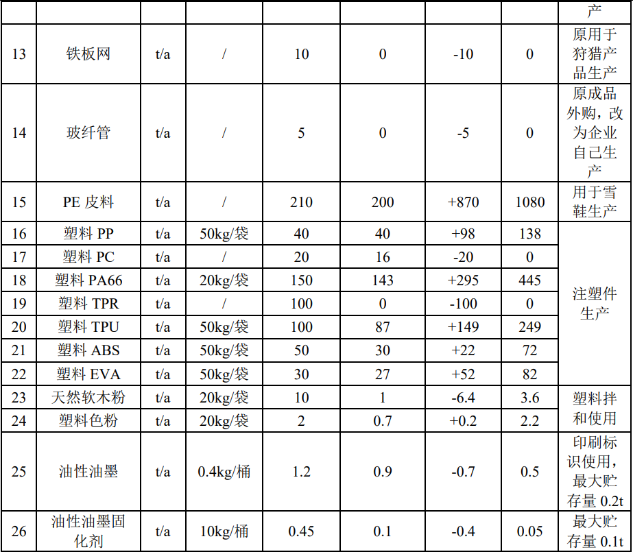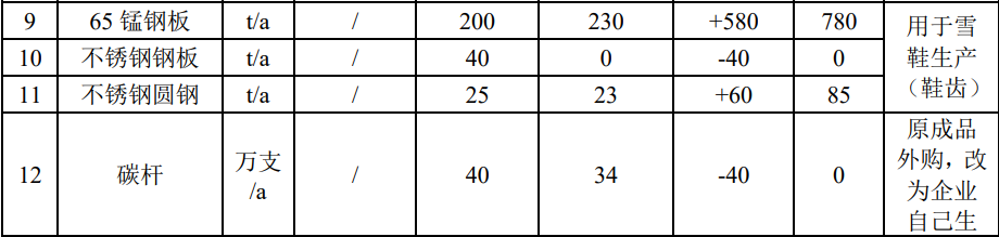 (2)產(chǎn)能調(diào)整:增加運(yùn)動(dòng)杖、雪地行走鞋、戶外野營(yíng)用品生產(chǎn)產(chǎn)能,其中運(yùn)動(dòng) 杖由100萬(wàn)對(duì)/年擴(kuò)產(chǎn)到250萬(wàn)對(duì)/年、雪地行走鞋由30萬(wàn)雙/年擴(kuò)產(chǎn)到100萬(wàn)雙/年、 戶外野營(yíng)用品由50萬(wàn)套/年擴(kuò)產(chǎn)到150萬(wàn)套/年。