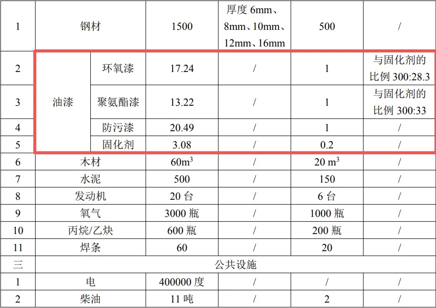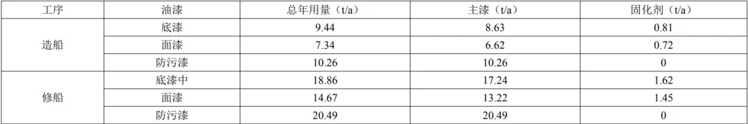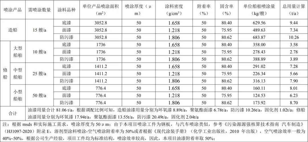2、修船:本項目維修的船舶主要以海洋工程船舶、漁船、拖輪為主,由于每艘船舶維修需求不一致,一般僅需噴涂生銹部分(即吃水部分船身),本項目按照最大吹水面積進(jìn)行核算,則大修船舶每艘噴涂面積為70×14+14×4.5×2+70×4.5×2=1736m2.中修船舶每艘噴涂面積為60×12+60×4.8×2+12×4.8×2=1411.2m2.小修船舶每艘噴涂面積為40×10.5+14×3.3 ×2+40×3.3×2=776.4m2.