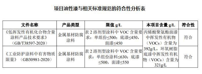 油性漆:根據涂料檢測報告可知,本項目丙烯酸聚氨酯面漆中揮發(fā)性有機物(VOCs)含量為315g/L,環(huán)氧樹脂 底漆中揮發(fā)性有機物(VOCs)含量為 331g/L,與《低揮發(fā)性有機化合物含量涂料產品技術要求》(GB/T38597-2020)及《工業(yè)防護涂料中有害物質限量》(GB30981-2020)等要求對比分析情況見下表。