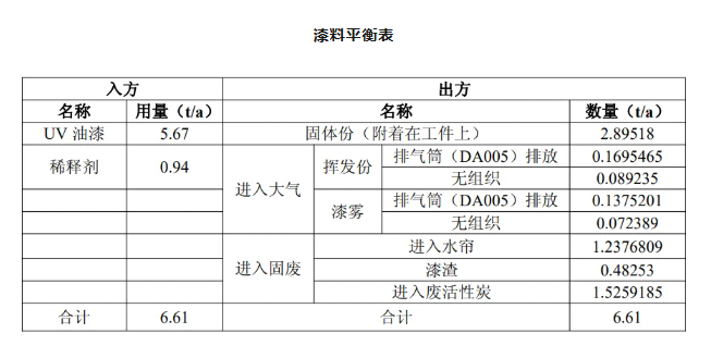 項(xiàng)目設(shè)置的噴漆房、UV光固化通道均為密閉設(shè)置,因此噴漆工段、烘干工 段共用一套有機(jī)廢氣凈化裝置。由于噴漆、烘干均在密閉的空間內(nèi)進(jìn)行,因此廢 氣的收集率較高,可達(dá)95%。水簾對(duì)漆霧的過濾效率可達(dá)90%以上;可以有效去除噴漆過程中產(chǎn)生的漆霧,但對(duì)有機(jī)廢氣沒有吸收作用,因此在水簾后設(shè)置一套有機(jī)廢氣凈化系統(tǒng)“采用活性炭吸附+脫附+催化燃燒裝置,對(duì)有機(jī)廢氣的總體處 理效率要求達(dá)90%。項(xiàng)目油漆平衡見下表: