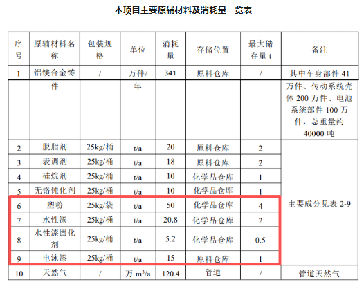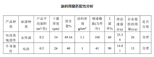 對于電池系統(tǒng)部件,采用的油漆種類為水性漆。其產(chǎn)品平均面積為每套0.2平方米,干膜厚度達到34微米,固含量占比49.16%,涂料密度為1.1克每立方厘米。年噴漆數(shù)量為100萬件,上漆率為60%。理論漆量需求為25.36噸每年,而企業(yè)提供的用量是26噸每年,判定為合理。