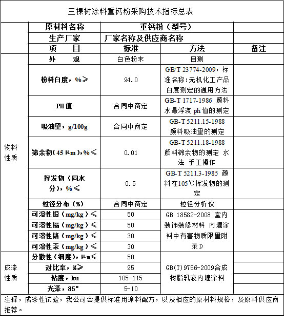 三棵樹涂料重鈣粉類采購技術(shù)指標(biāo)