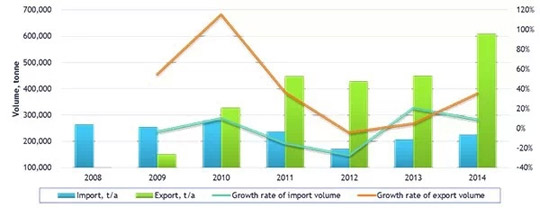 圖1、2008-2014年中國鈦白粉進出口情況