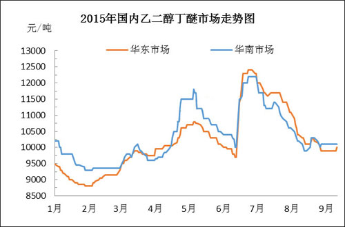 由上圖可以看出,進入9月份后國內乙二醇丁醚市場止跌企穩(wěn),華東地區(qū)散水現金成交參考在9900-10000元/噸,雖臨近周末市場稍有探漲意向,但需求低迷及新報關貨物的陸續(xù)沖擊下實單成交并未實質上漲。華南地區(qū)散水現金報盤參考10000-10100元/噸,而后期伴隨部分國產貨源及華東進口貨的陸續(xù)補充下,市場仍存進一步下跌空間。