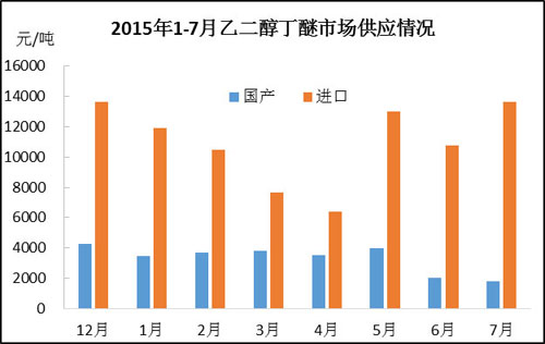 由上圖可見,2015年1-4月份乙二醇單丁醚進口量呈遞減走勢,而5月份開始市場進口貨激增,一方面進口貿易商對后期市場多抱有較樂觀心態(tài),另一方面春節(jié)過后的遠洋貨陸續(xù)到港。而在6月中旬天音工廠出現事故國產貨供應驟減后,7月份丁醚進口量再創(chuàng)歷史新高。