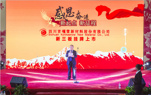 貢嘎雪掛牌上市當天,公司隆重的舉行了以“感恩,奮進;新起點,新征程”為主題的慶?;顒?。出席活動的有貢嘎雪公司全體員工,石棉縣工商聯(lián)領導,上市輔導機構、金融單位、石棉當?shù)仄髽I(yè)代表,以及社會各界友好人士等,大家共渡了一段美好時光。當主持人清晰有力的宣布貢嘎雪公司成功正式掛牌上市時,響起了振奮人心、延續(xù)不絕的禮炮聲。慶?;顒影才帕擞^看貢嘎雪發(fā)展歷程、上市歷程和領導關懷照片集、VCR宣傳片、領導和企業(yè)代表講話、抽獎、精彩的文藝表演、豐盛的晚宴,以及燃放煙花。慶祝儀式上,貢嘎雪董事長高萬平先生作了熱情洋溢的致辭,對關心支持公司發(fā)展的領導、單位、企業(yè)以及社會各界人士表示感謝,并對公司未來充滿信心,將帶領全體員工再創(chuàng)更大成就回報股東、回報社會。