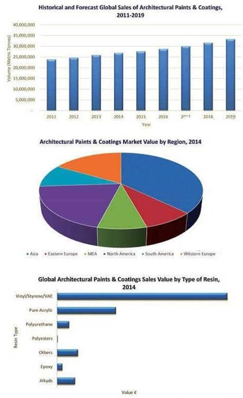 【中國涂料采購網(wǎng)】近期,IRL首次發(fā)布了全球建筑涂料市場趨勢預測報告,建筑涂料市場將繼續(xù)保持持續(xù)穩(wěn)定增長,預計2019年將突破3300萬噸,年均復合增長率4%左右,兩倍于全球經(jīng)濟總量增長前景預測。建筑涂料全球市場容量將從2014年的490億歐元增長至2019年的610億歐元。