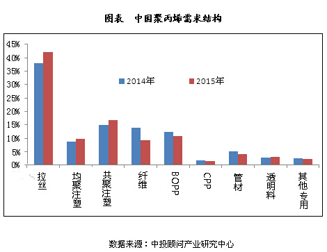 不考慮進(jìn)口原料的影響,假定國(guó)產(chǎn)聚丙烯原料產(chǎn)需平衡,那么我們可以用國(guó)內(nèi)聚丙烯原料的生產(chǎn)結(jié)構(gòu)來(lái)反饋聚丙烯的下游需求結(jié)構(gòu)。在2015年中國(guó)的聚丙烯需求結(jié)構(gòu)中,拉絲占比最大,在42%左右。注塑排名第二,在26.52%。相較2014年,拉絲、注塑、透明料均有不同幅度小幅上漲,但纖維、膜料、管材、其他專用料呈下跌態(tài)勢(shì)。其中纖維占比在9.4%,同比下跌31.9%,較2013年漲1.3%,雖然纖維用途廣泛,但2014年以后,神華寧煤等煤制烯烴企業(yè)轉(zhuǎn)戰(zhàn)纖維領(lǐng)域,增加了纖維原料的供應(yīng)量,2014年纖維占比大增,2015年趨于合理。膜料、管材受下游需求有限制約,近幾年來(lái)一直呈下降態(tài)勢(shì)。注塑、透明料等附加值較高的原料,緊追發(fā)達(dá)國(guó)家消費(fèi)步伐,占比逐年增長(zhǎng)。值得一提的是拉絲,近幾年來(lái)消費(fèi)占比逐年走低,但2015年卻出現(xiàn)反彈,主要由于2014年新增的340萬(wàn)噸聚丙烯產(chǎn)能,有56%是煤制烯烴,主產(chǎn)拉絲,大大提升了拉絲占比。