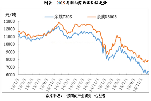 行情如此下跌的原因何在?一方面,全球經(jīng)濟(jì)低迷,國(guó)際油價(jià)不斷下跌,價(jià)格已達(dá)6年來(lái)最低點(diǎn),從5月初的60美元/桶左右下跌至現(xiàn)在的37美元/桶左右,加之聚丙烯期貨跟隨原油市場(chǎng)保持低位震蕩態(tài)勢(shì),市場(chǎng)缺乏實(shí)質(zhì)性利好因素支撐,隨之行情進(jìn)入下行通道;另一方面,傳統(tǒng)的“金九銀十”,需求旺季已不像往年一樣好,不管是從上游單體、石化企業(yè)還是終端需求,均無(wú)一利好消息支撐市場(chǎng)上漲。年底雖然石化仍有心力挺市場(chǎng),可惜只是“郎有情而妾無(wú)意”,下游需求低迷和中間商無(wú)意備貨,導(dǎo)致市場(chǎng)貨源流通緩慢。面對(duì)如此低迷的行情,終端廠商均對(duì)后市持觀望態(tài)度,多數(shù)維持低庫(kù)存運(yùn)行。