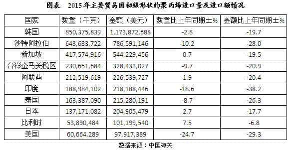 2015年,我國(guó)初級(jí)形狀的聚丙烯進(jìn)口額排名前五大市場(chǎng)為韓國(guó)、沙特阿拉伯、新加坡、臺(tái)澎金馬關(guān)稅區(qū)、阿聯(lián)酋。其中,進(jìn)口額最高的是韓國(guó),為1,173,872,688美元,比上年同期下降19.7%;其次是沙特阿拉伯,為786,591,146美元,比上年同期下降28.0%;最低的是阿聯(lián)酋,為226,539,727美元,比上年同期下降20.4%。