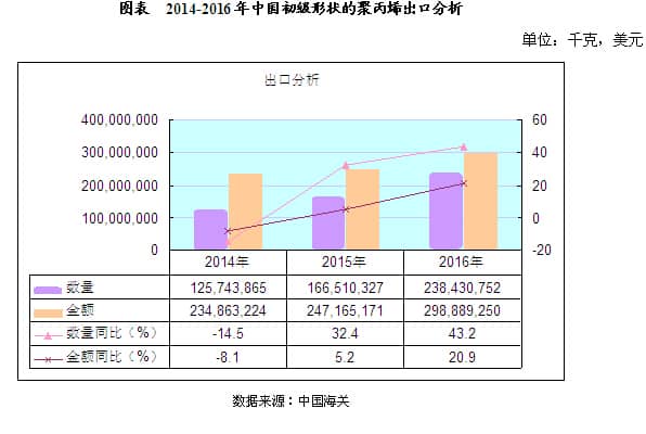 2014-2015年,我國(guó)初級(jí)形狀的聚丙烯出口總量由125,743,865千克增長(zhǎng)到166,510,327千克,增長(zhǎng)了32.4%;2016年,我國(guó)初級(jí)形狀的聚丙烯出口總量為238,430,752千克,比上年同期增長(zhǎng)43.2%。
