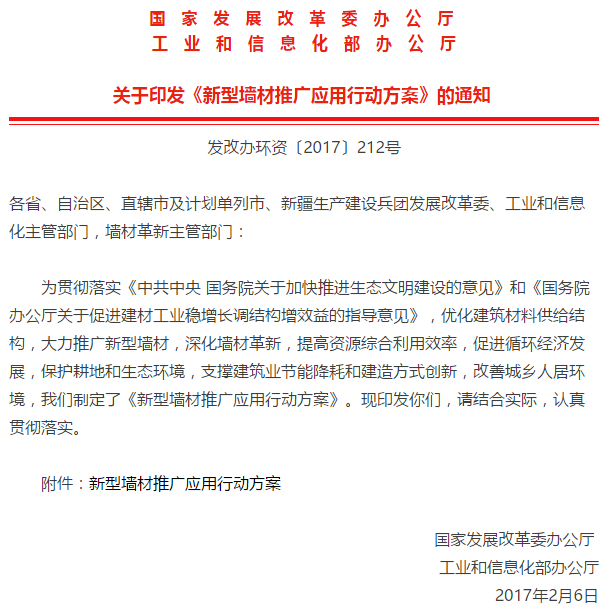 新型墻材推廣應(yīng)用是建材工業(yè)推進(jìn)供給側(cè)結(jié)構(gòu)性改革的有效抓手,墻材革新是大力推進(jìn)生態(tài)文明建設(shè),促進(jìn)循環(huán)經(jīng)濟(jì)發(fā)展的重要舉措。自上世紀(jì)九十年代以來,墻材革新為建材工業(yè)和城鄉(xiāng)建設(shè)可持續(xù)發(fā)展做出了重要貢獻(xiàn)。但我國(guó)城鄉(xiāng)區(qū)域發(fā)展不平衡,空間開發(fā)粗放低下,資源約束趨緊,生態(tài)環(huán)境惡化趨勢(shì)尚未得到根本扭轉(zhuǎn),遏制毀田燒磚、節(jié)約保護(hù)資源,發(fā)展本質(zhì)安全、節(jié)能環(huán)保、輕質(zhì)高強(qiáng)的新型墻材也成為建材工業(yè)亟待破解的發(fā)展難題,也是建材工業(yè)堅(jiān)持創(chuàng)新驅(qū)動(dòng)增強(qiáng)發(fā)展內(nèi)生動(dòng)力的客觀要求。為加快推進(jìn)墻材革新,推廣應(yīng)用新型墻材,制定本行動(dòng)方案。